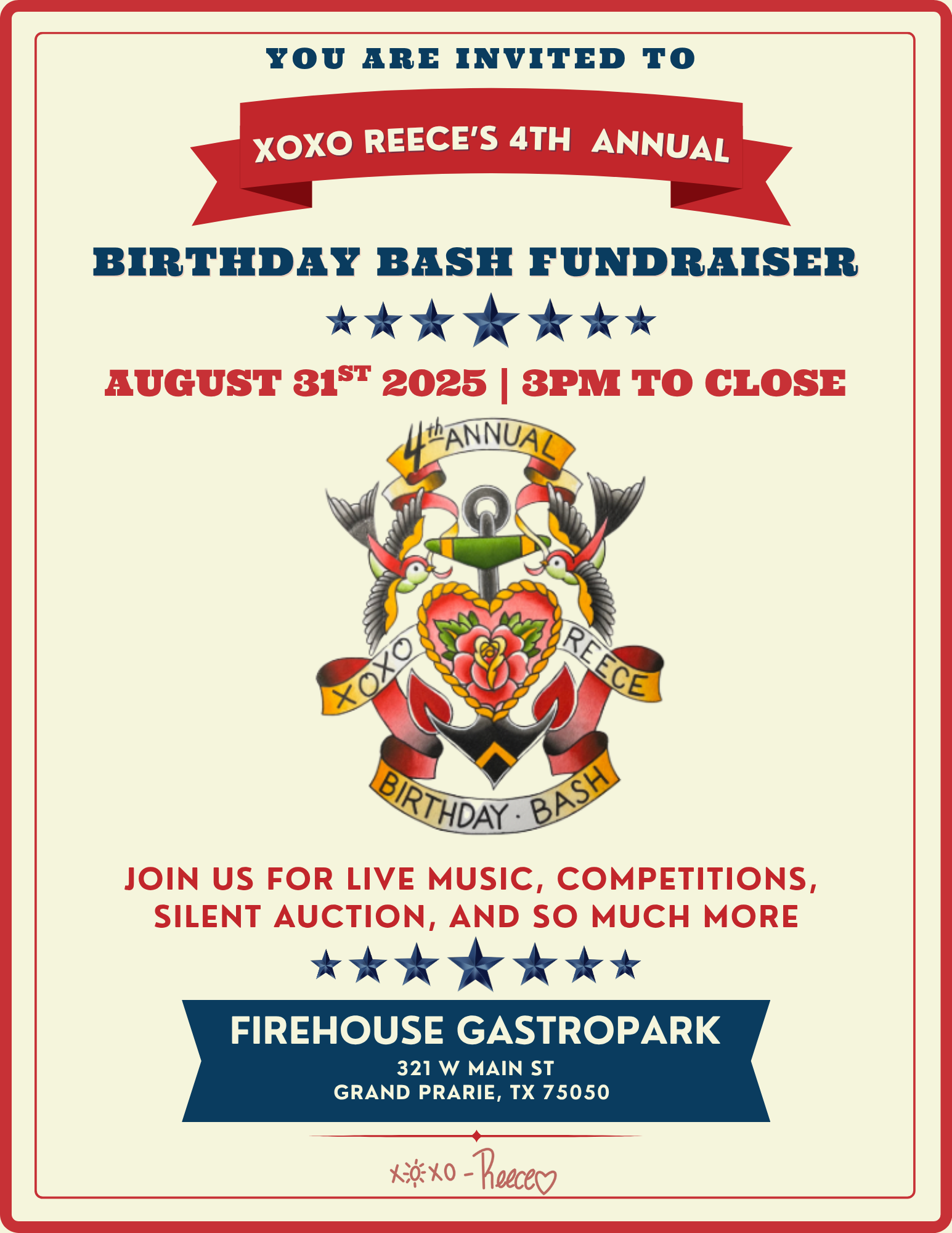 We’re thrilled to invite you to support the 4th Annual XOXO Reece Birthday Bash Fundraiser, happening on Sunday, August 31, 2025 at GastroPark in Grand Prairie! This free, public event brings together our community to honor Reece Shepard’s legacy with music, food, games, and heart—all while raising funds to empower youth through scholarships, mentorship, and outreach.